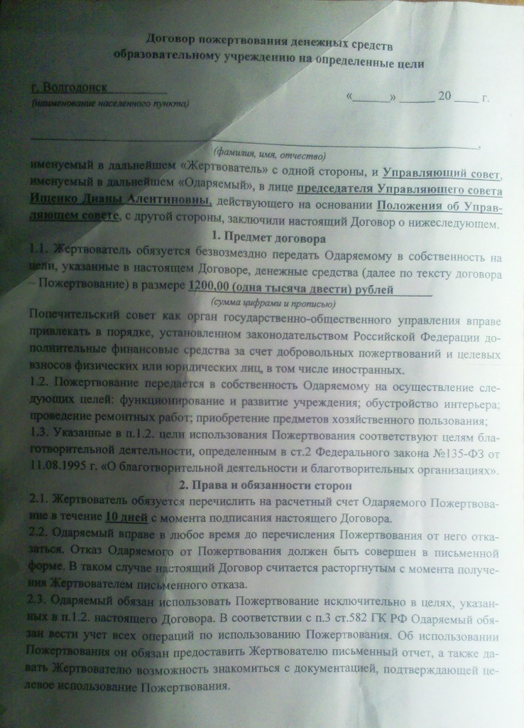 Ребенок принес из школы договор, ну и что тут такого, казалось бы! Но вот заголовок у него очень оригинальный: "Договор пожертвования денежных средств образовательному учреждению на определенные цели". Стороны договора - "Жертвователь" и "Одаряемый", так бы сразу и написали ЖЕРТВА с одной стороны.... Но вот вторая сторона, почему-то не школа, а председатель Управляющего совета. Кто этот председатель, какого совета, кто его утверждал, остается загадкой. Но самое интересное, что данный договор обязали подписать и принести обратно в школу, не завасимо от того, хочу ли я стать жертвой или нет! Размер жертвоприношения составляет 1200 рублей, которые необходимо внести в течение 10 дней после подписания. Причем если жертва не согласна, то до внесения денежных средств может договор расторгнуть, но только письменно. Все время возникает вопрос, где деньги от Мин.Образования, куда идут и на что, если постоянно собирают какие то взносы? Долго нас будут считать ЖЕРТВАМИ и требовать от нас оплаты на нужды школы? Когда прекратится это беззаконие? Когда надзорные организации поставят жирную точку в этих делах? Особо переживающих за своих детей прошу не писать о том, что это же для наших детей, а я вот гад зажал 1200 для улучшения условий прибыванимя своего чада. Мне не жалко, просто надоело быть дойной коровой в школе, детском саду, поликлинике и т.д.