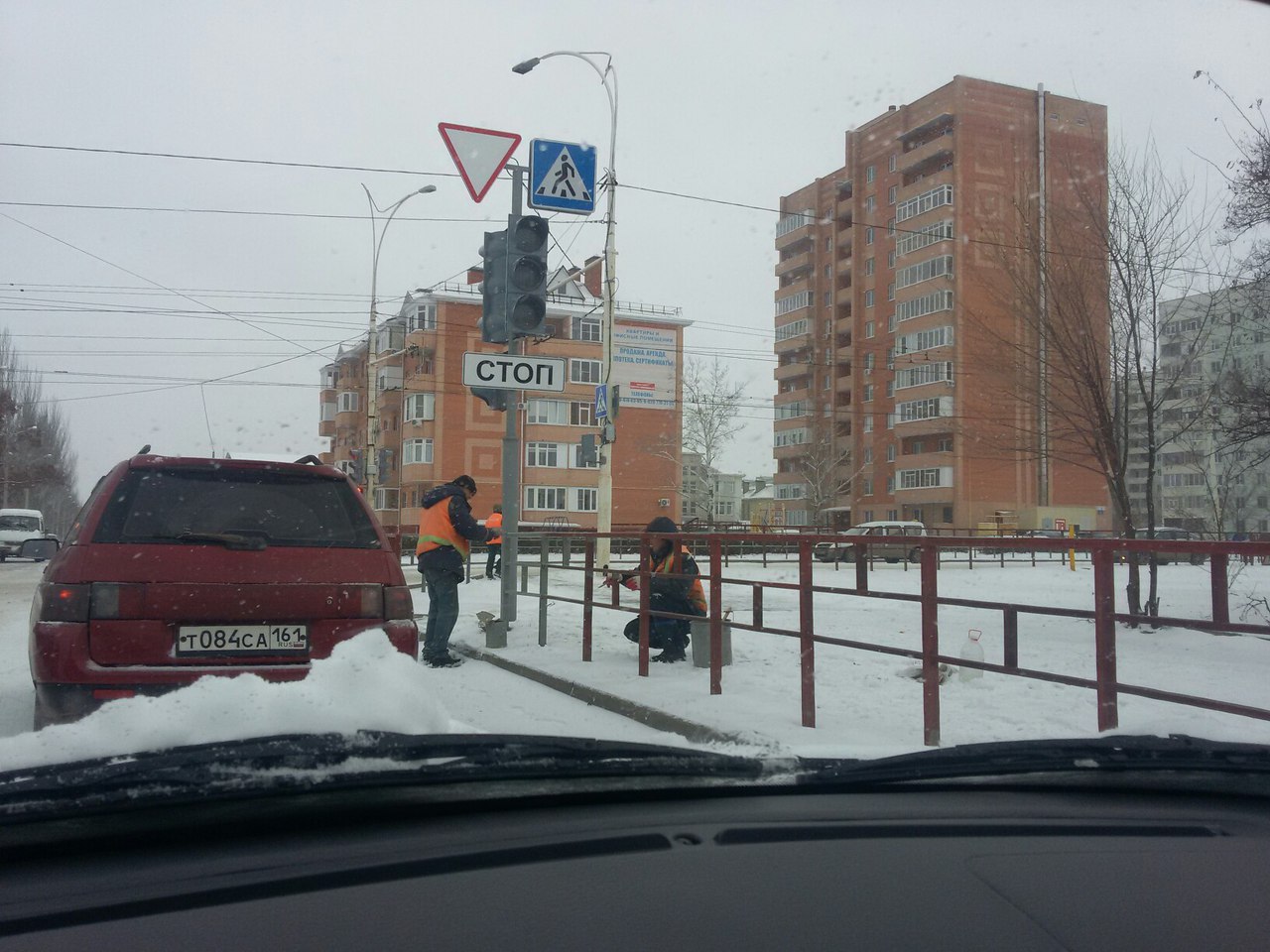 На Гагарина красят заборы...Самое время, когда на улице снегопад