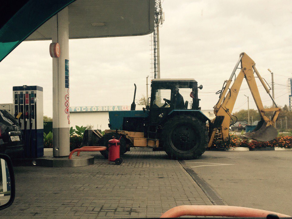 Стоял как-то на заправке на Строителей...И к соседней колонке подъехал трактор...Первый раз видел трактор на заправке в центре города...
