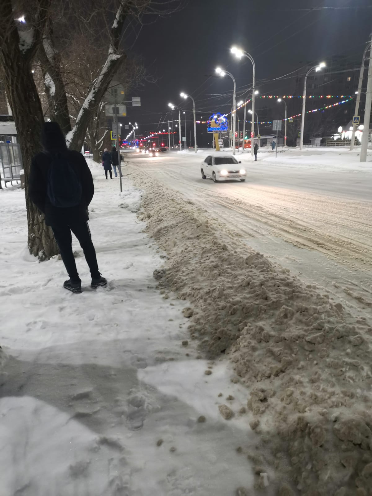 Такая забота о людях. Весь снег скинули на обочину. К утру все замерзло и оледенело.
