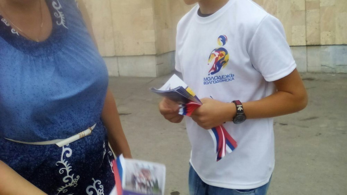 Десять волонтеров раздавали трехцветные ленточки на Комсомольской площади. 1000 экземпляров юные добровольцы подарили прохожим за полчаса. Акцию проводил отдел по молодежной политике администрации Волгодонска. До этого трехцветные ленточки раздавали горожанам в старой части города на площади Победа 18 августа.