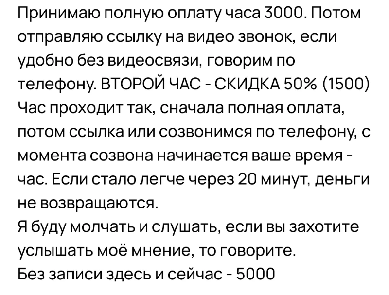 Цена за такую «терапию» – 3000 рублей за час. Причем, схема оплаты весьма оригинальна: полная предоплата, а затем – либо ссылка на видеозвонок, либо телефонный разговор. Важно отметить, что время отсчитывается с момента начала разговора. И даже если вам стало легче через 20 минут, деньги, увы, не возвращаются. «Я буду молчать и слушать, если вы захотите услышать мое мнение, то говорите», – обещает Анна, намекая, что ее роль – это скорее роль внимательного слушателя.