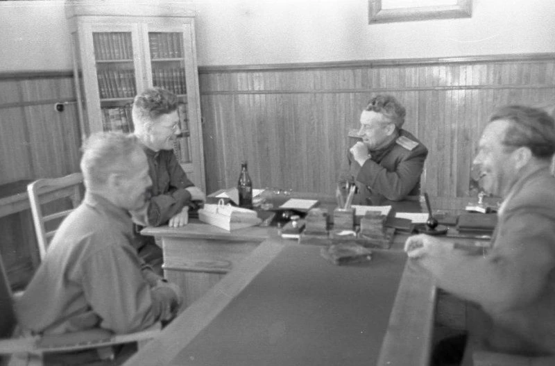 В кабинете начальника строительства Цимлянского гидроузла Василия Барабанова в поселке Ново-Соленый (июль 1952 года) писатели Михаил Шолохов, Виталий Закруткин, Александр Бахарев. Фотография из фондов Государственного музея-заповедника М.А. Шолохова «Тихий Дон».