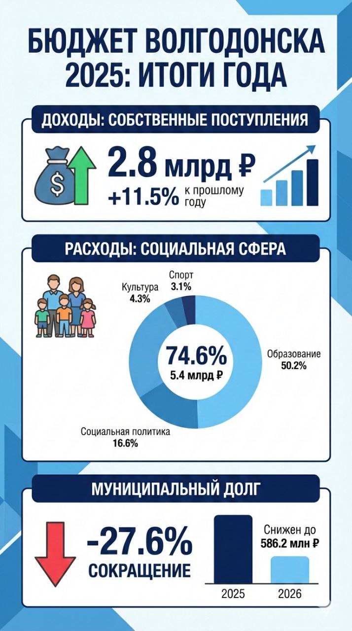 Администрация Волгодонска подвела финансовые итоги 2025 года, зафиксировав рост собственных доходов и значительное сокращение муниципального долга. Об этом сообщил глава города Дмитрий Вельможко в своем телеграм-канале.