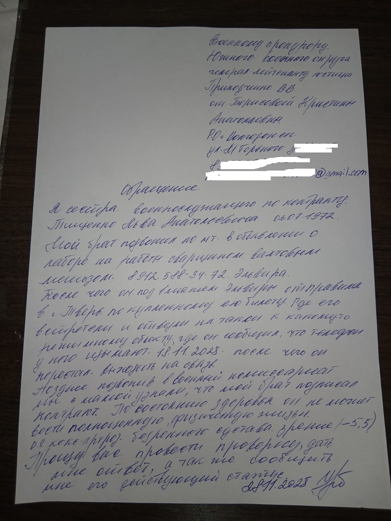 Кристина Борисова уже написала заявления военному прокурору Южного военного округа и в военное следственное управление Следственного комитета. Заявления были переданы в Ростове-на-Дону адресатам 28 ноября. Пока ответы из следственных органов не получены. Уже третью неделю родные Льва Тищенко не могут связаться с ним и просто понять все детали этой истории. Кристина Борисова и ее пожилая мать просят Минобороны найти их брата и сына.