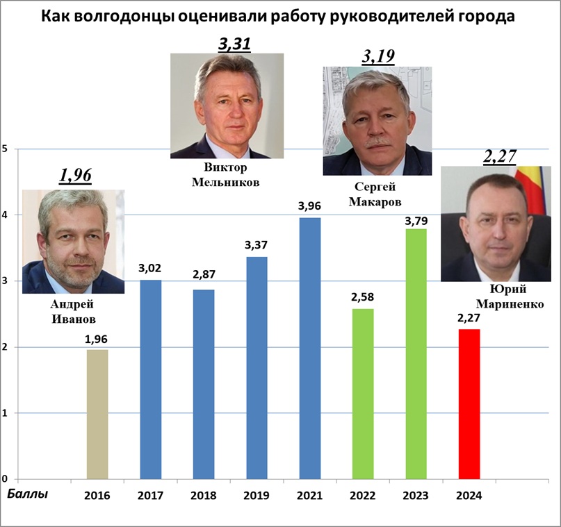 В среднем с 2016 года (в 2020 году оценка не производилась) лучшим руководителем города был признан Виктор Мельников, к слову последний чиновник, который возглавлял Волгодонск, с большим опытом публичной политики и участия в открытых избирательных компаниях. Виктор Мельников оказался единственным главой администрации города, проработавшим у руля Волгодонска в долгую — почти два полных срока. А одобрение его работы гражданами (тогда в городе начали реализовываться такие крупные проекты, как строительство моста через Сухо-Соленовский залив, школы в квартале В-9) достигло максимальных значений в последний год работы Мельникова на посту администрации. Сергей Макаров и Юрий Мариненко фактически не смогли отработать полные сроки, проявить себя в полной мере и оставить наследие, которое горожане могли бы прочно связать с их пребыванием на главной должности города.
