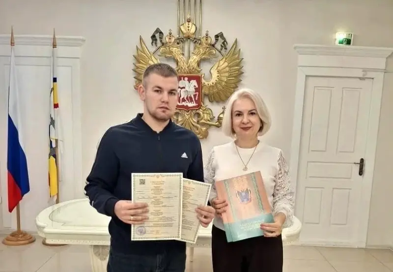 В молодой семье Даниила и Марины родилась «королевская двойня» — дочь Арина и сын Андрей. Первый документ в жизни детей пришел получать их отец. Свидетельство о рождении папе вручила начальник Волгодонского отдела ЗАГС – Наталья Ульченко.