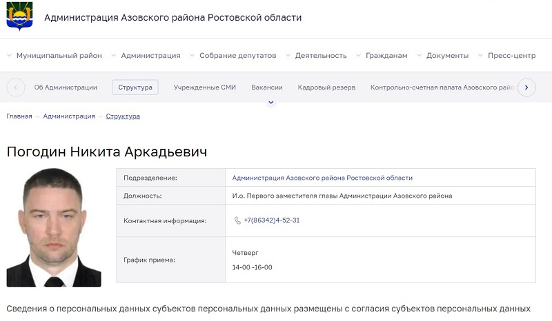 В администрации Азовского района Никиту Погодина представили еще в августе 2025 года. О его увольнении из администрации Волгодонска стало известно 8 августа, а уже 11 августа он начал работу в Азове. По состоянию на ноябрь, его должность пока содержит приставку «и.о.». На период отсутствия на рабочем месте главы района Сергея Комарова, Никита Погодин будет первым лицом района.