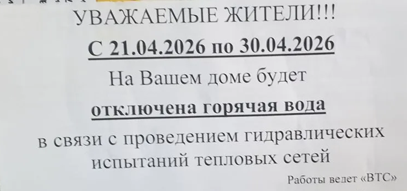 Публикация графика отключений горячей воды прошла не без казуса. Изначально гидравлические испытания планировали провести с 21 по 30 апреля, о чем и были уведомлены управляющие компании. Затем испытания перенесли на июнь, но сотрудники УК уже успели заклеить половину города объявлениями о грядущих отключениях горячей воды на следующей неделе. Теперь такие объявления экстренно срывают. Но в любом случае, в июне без горячей воды будет жить проще.