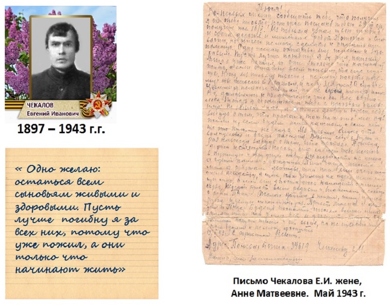 Евгений Иванович был сильным человеком. У него хватило сил встать на защиту Отечества, хватило сил воспитать сынов своих для этого Отечества, хватило сил отстоять Москву, но был смертельно ранен подо Ржевом. Хватило сил умереть достойно. А вот чтобы вернуться домой, на это уже сил у Евгения Ивановича не хватило. И похоронен он под номером № 2343 в Братской могиле в Псковской области. Это ли не подвиг учителя на войне! Но на этом подвиг Евгения Ивановича не заканчивается! Его внук, Чекалов Владислав Константинович, 28 лет был директором нашей школы. Сегодняшний директор, Машинков Юрий Владимирович, - правнук Евгения Ивановича. А русский язык и литературу ведёт праправнучка – Елисеева Ульяна Сергеевна.