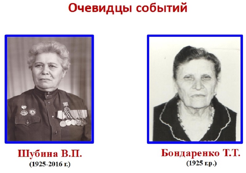 Школьники и поисковики ездили в архивы Ростова-на-Дону, и одновременно искали очевидцев, которые жили в Цимлянской в то время. Опросить удалось Таисию Трофимовну Бондаренко и Веру Петровну Шубину.