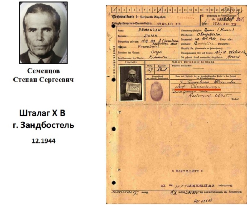 В результате поисков была найдена еще одна фамилия – Семенцов Степан Сергеевич. 18-летним пареньком он по направлению колхозной комсомольской ячейки работал в школе МТС, разбирая и собирая вместе с учениками-старшеклассниками тракторные моторы. Затем армия и война. Семенцов на фронте с 22 июня 1941 года. А 19 сентября 1941 года он попадает в плен под Киевом. И вот с этого момента Степан Сергеевич находится за колючей стеной фашизма.
