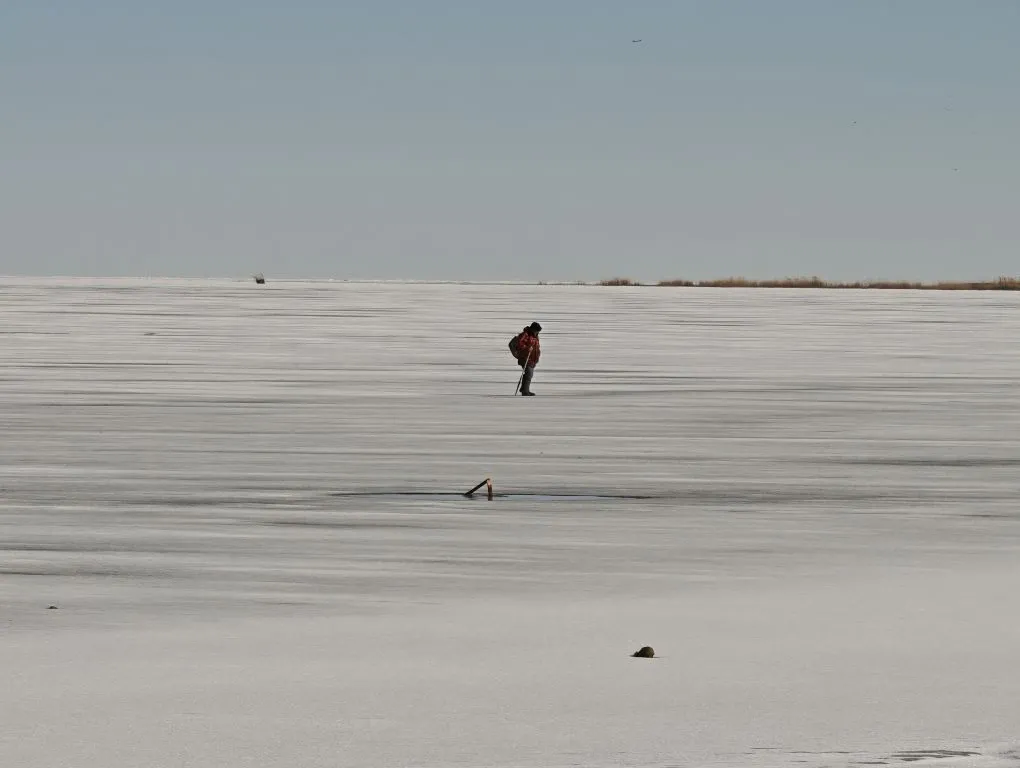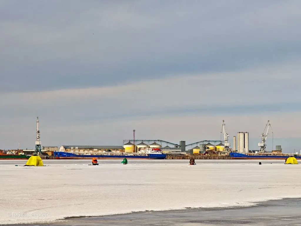Бескрайнее ледяное поле, раскинувшееся до самого горизонта. На льду, словно яркие точки на белом полотне, расположились несколько фигур рыбаков. Их присутствие – единственное свидетельство человеческой активности на этой замерзшей территории. На заднем плане просматривается силуэт города с высокими домами и промышленными объектами, контрастирующий с природной стихией.