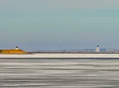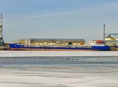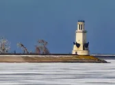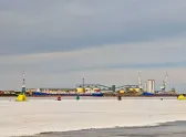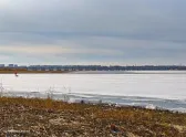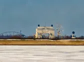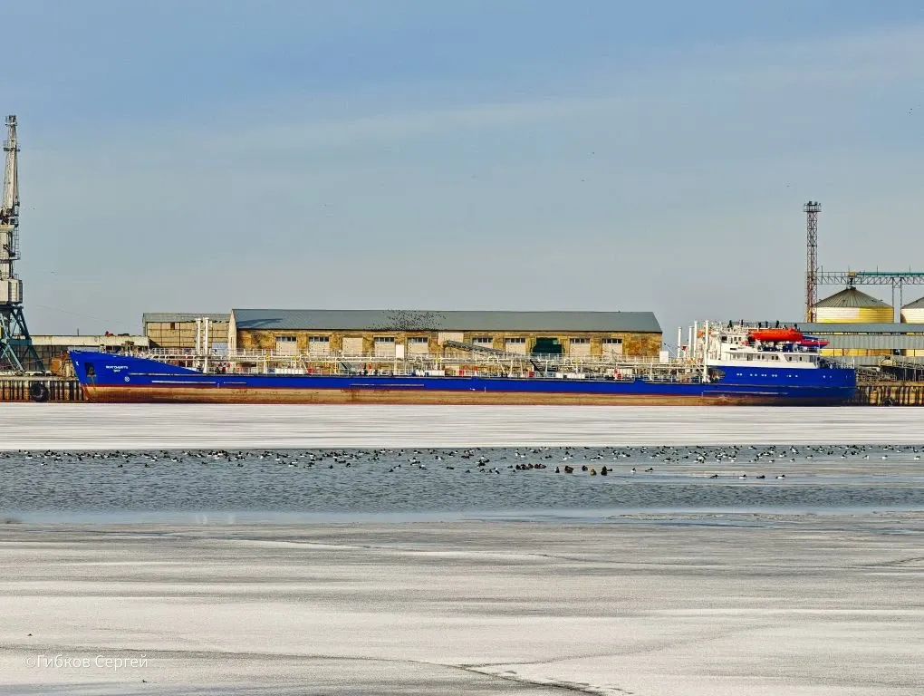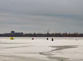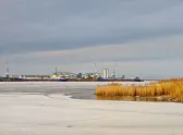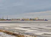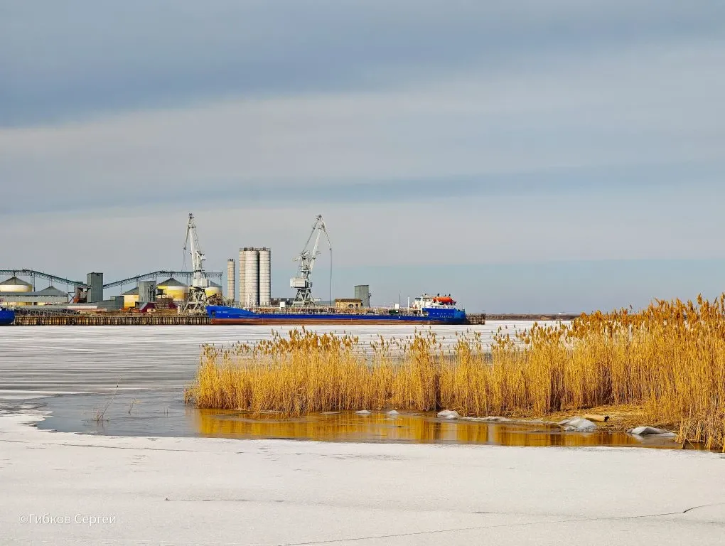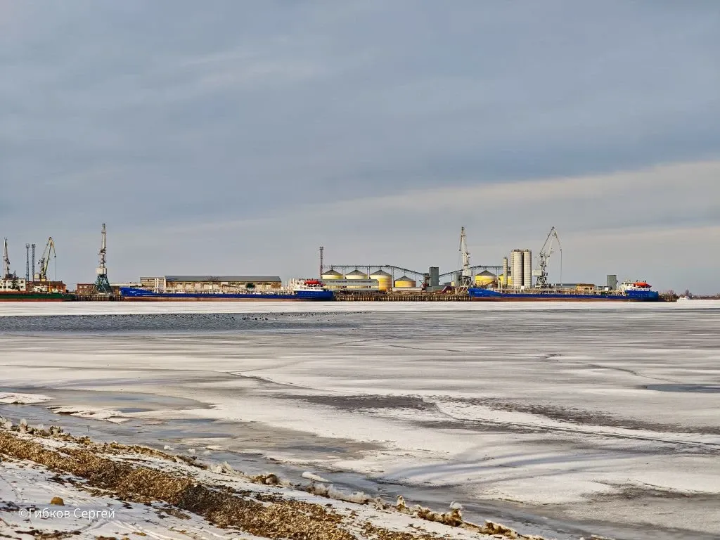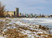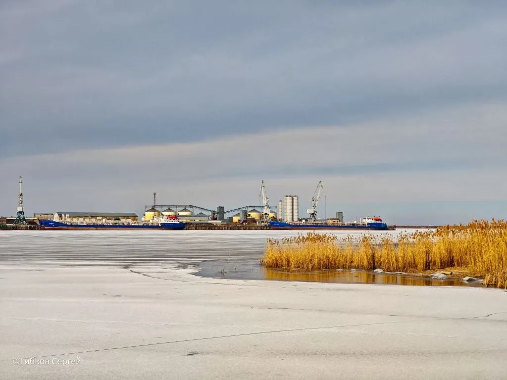 Еще один снимок погружает нас в атмосферу заброшенных промышленных объектов. На переднем плане – живописный, но удручающий своей заброшенностью берег. На нем видны осколки льда, принесенные кромкой воды, и разбросанные камни, напоминающие о былых временах. Позади, на горизонте, возвышается величественное, старое здание элеватора, а рядом с ним – внушительные промышленные сооружения, в том числе, характерные портовые краны.