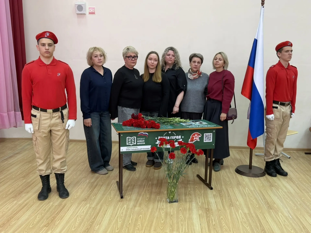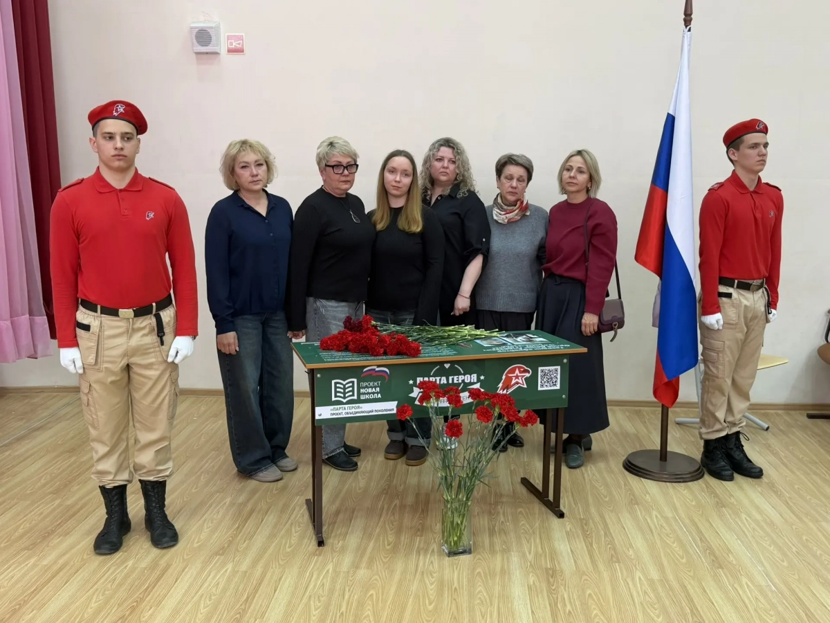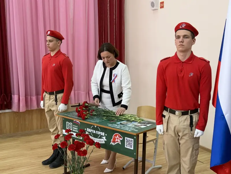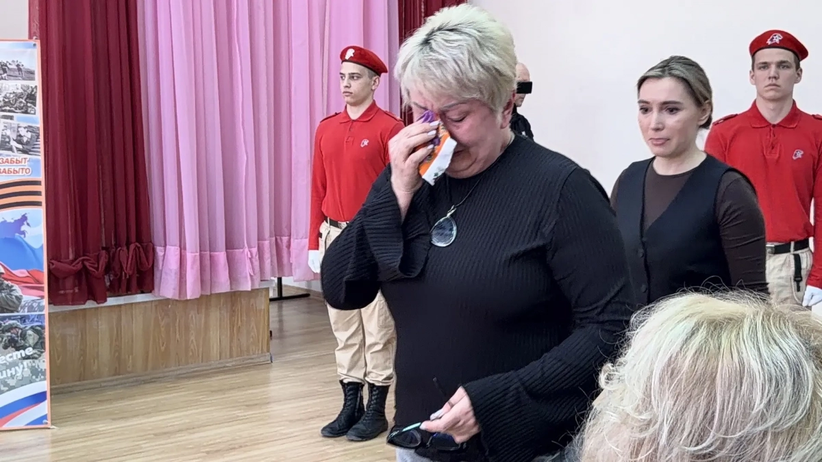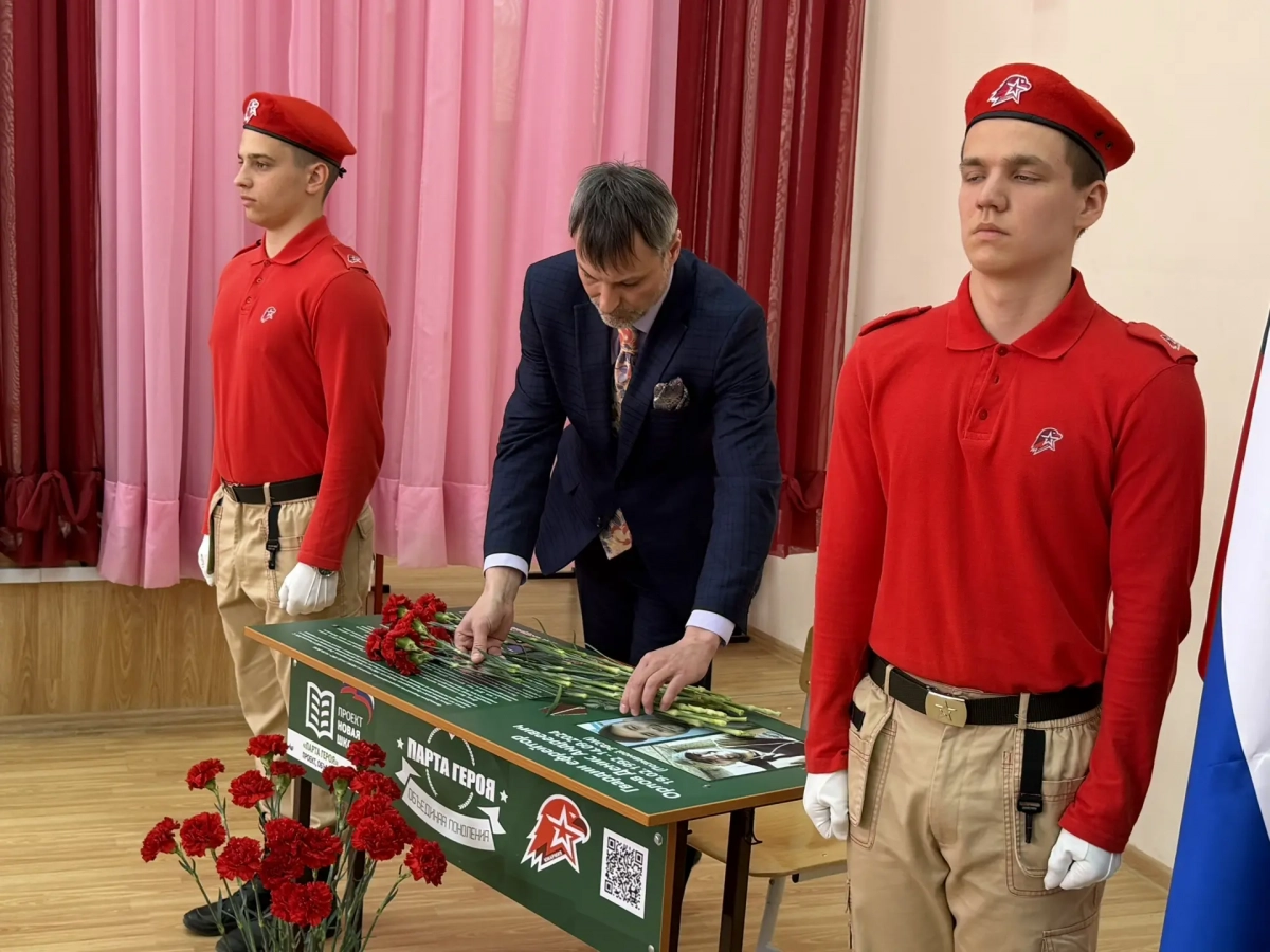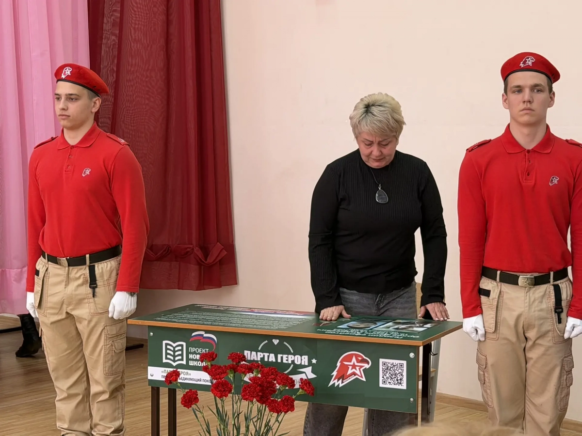 Директор школы Ирина Усова, едва сдерживая волнение, обратилась к семье погибшего, пообещав, что школа станет живым хранителем подвига их сына: