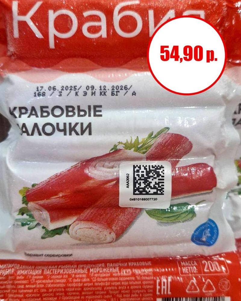 - Крабовые палочки 200 гр - 54, 90 рублей;