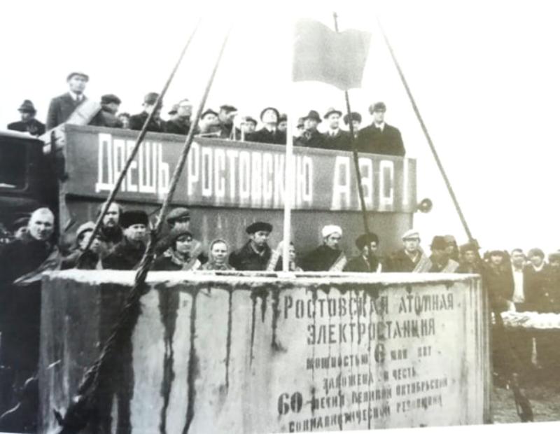 В 1977 году страна готовилась отметить 60-летие Великой Октябрьской социалистической революции. Этому событию и было приурочено начало строительства Ростовской АЭС. Первый камень, заложенный в основание электростанции, представлял собой обычный железобетонный блок с надписью, нанесенной краской: «Ростовская атомная электростанция мощностью 6 млн. КВт. Заложена в честь 60-летия Великой Октябрьской социалистической революции 28 октября 1977 года».