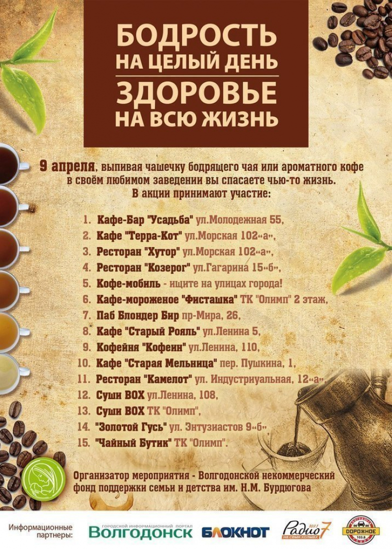 9 апреля на протяжении всего дня в городе будет проходить акция «Бодрость на целый день – здоровье на всю жизнь!». Цель акции: помочь больным волгодонским детям, которые нуждаются в дорогостоящем лечении.