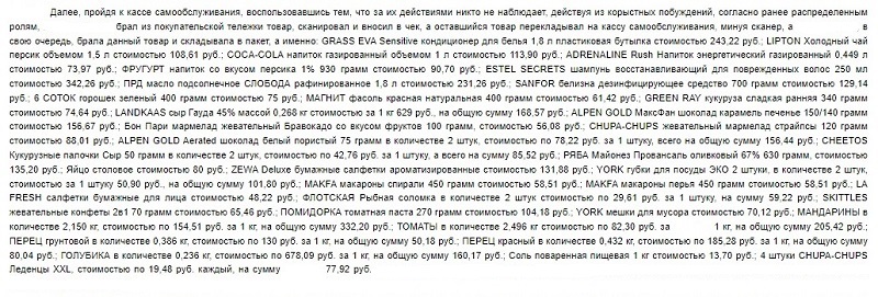 Согласно материалам следствия, подсудимые «заранее договорившись о совместном совершении преступления и распределив между собой роли, согласно которым часть товара Магомед Х.. оплатит на кассе самообслуживания, часть товара Милана М. поместит в пакет, минуя кассу самообслуживания». Их хитрый план почти удался.