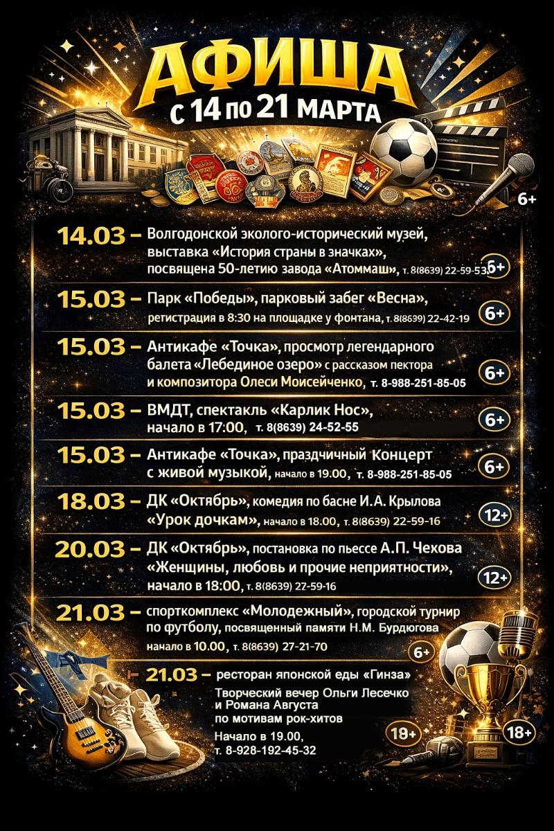Выставки, концерты, спектакли, спорт: куда пойти в Волгодонске с 14 по 21 марта. Сохраняйте афишу мероприятий.