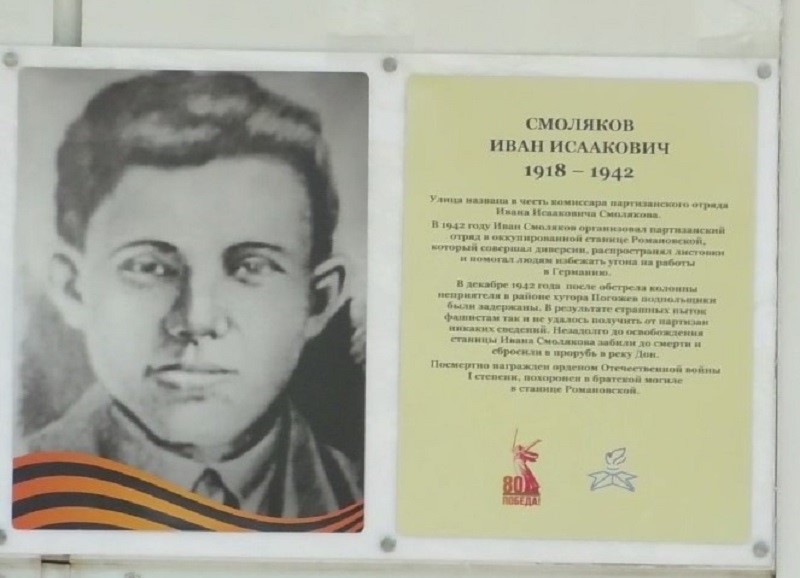 Иван Смоляков родился в 1918 году в семье крестьянина-бедняка. Работал учителем истории в Семенкинской школе, перед войной стал ее директором. Во время оккупации организовал партизанскую группу для ведения борьбы в тылу немецких оккупантов. При подготовке операции по взрыву моста через реку Дон, Иван Смоляков и его товарищи были арестованы и зверски казнены в станице Романовской.