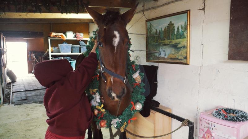 Знакомьтесь. Звезда конного подворья - андалузская гнедая кобылка Фина. Эта красавица на стройных ногах и с косичками на шее к встрече нового года готова – наряжена и накормлена.