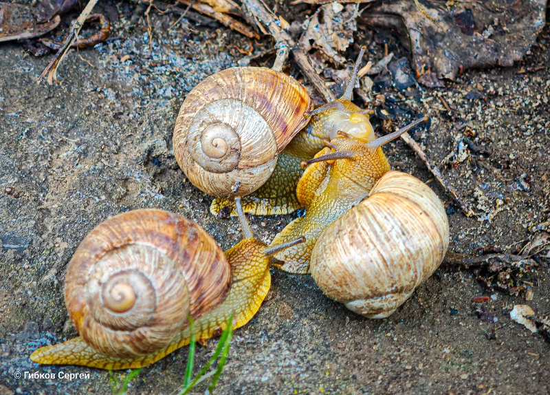 На газонах, в парках и садах города теперь можно наблюдать множество улиток, деловито ползающих по своим «матримониальным» делам.
