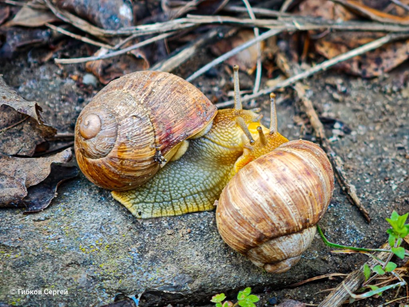 Виноградные улитки – гермафродиты. Это значит, что их организм обладает признаками как мужского, так и женского пола. В поисках партнера улитка активно движется, вытягивая туловище.