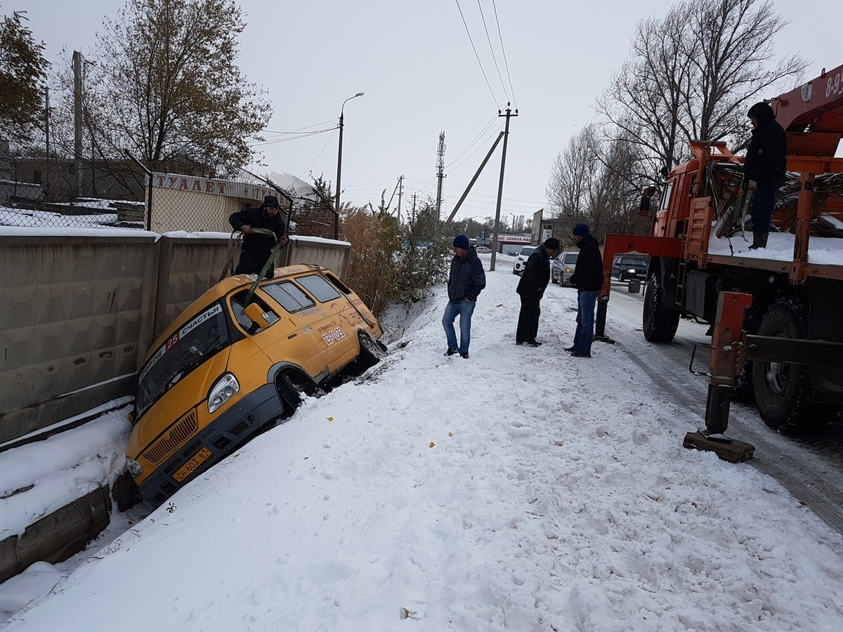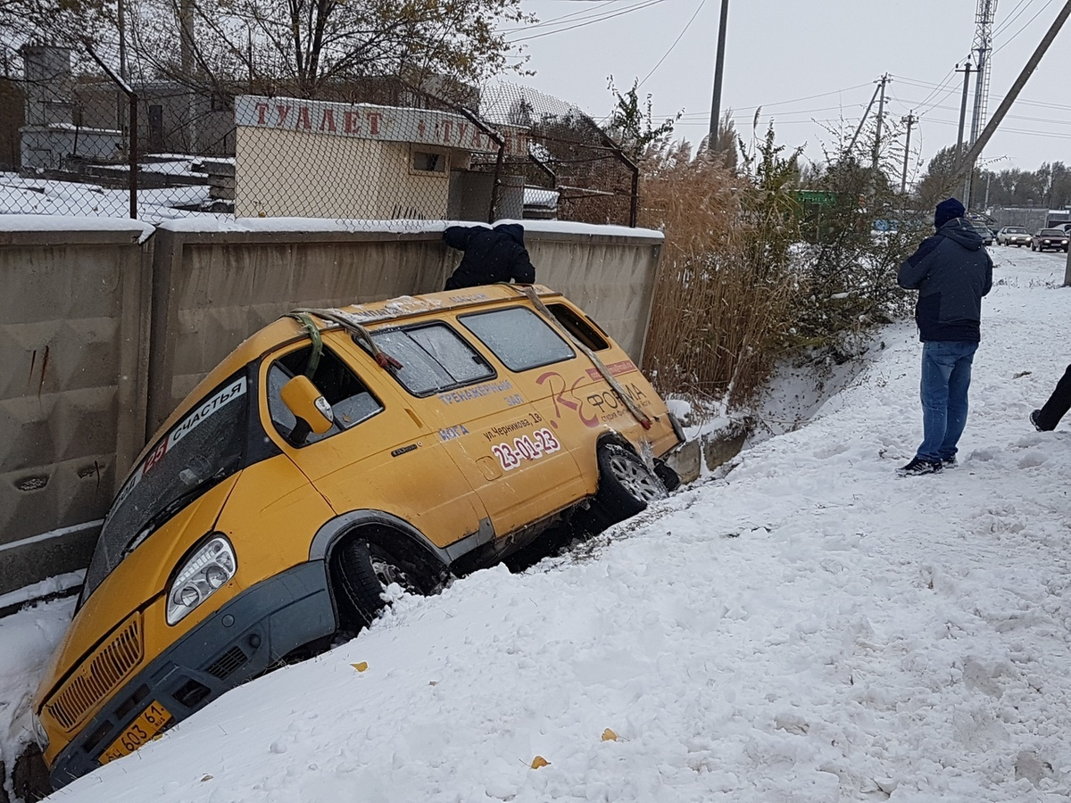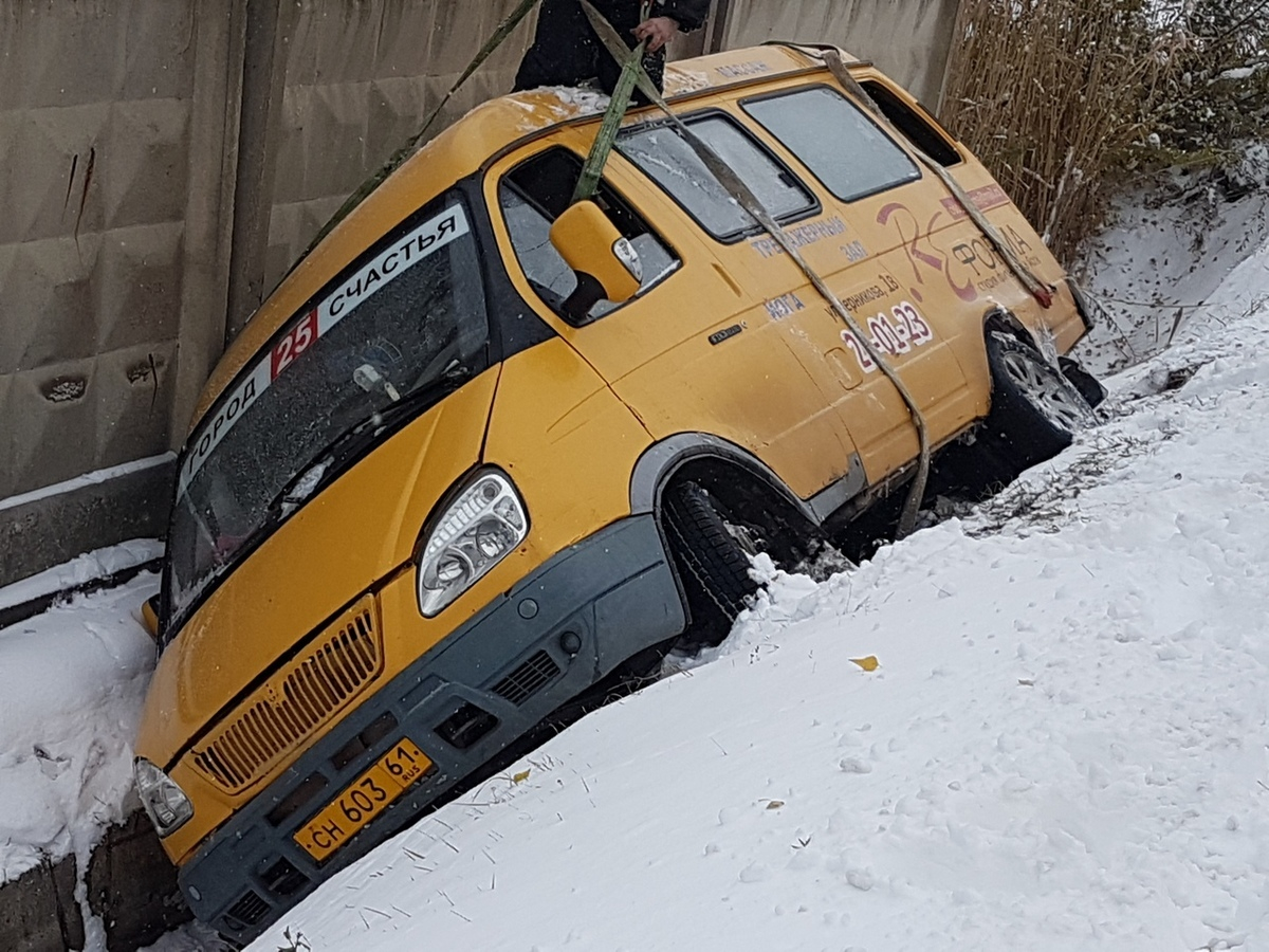 Маршрутное такси слетело с заснеженной дороги в ливневую яму в Волгодонске