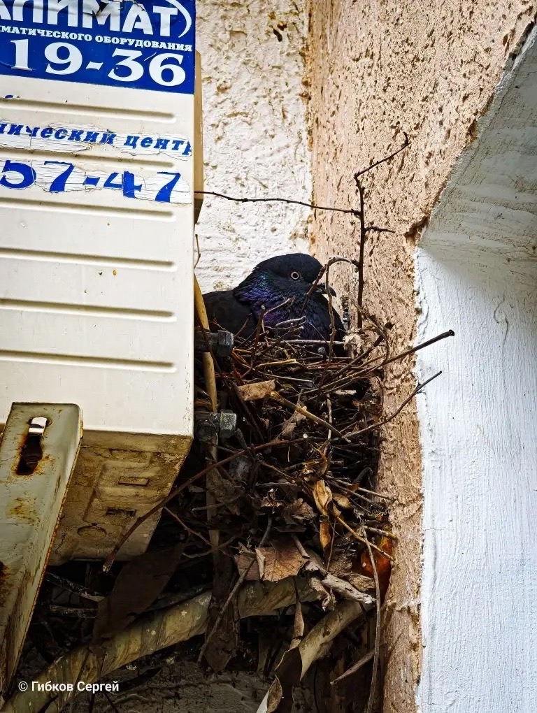 А вот среди этой кошачьей суеты, во дворе дома №15 по улице М.Кошевого Сергей Гибков заметил настоящий арт-объект. Этот странный голубь или голубка свила гнездо под открытым небом между стеной дома и кондиционером.