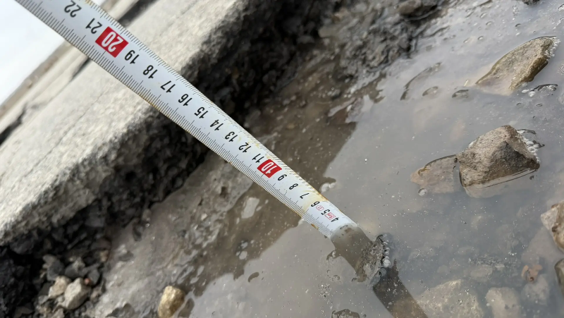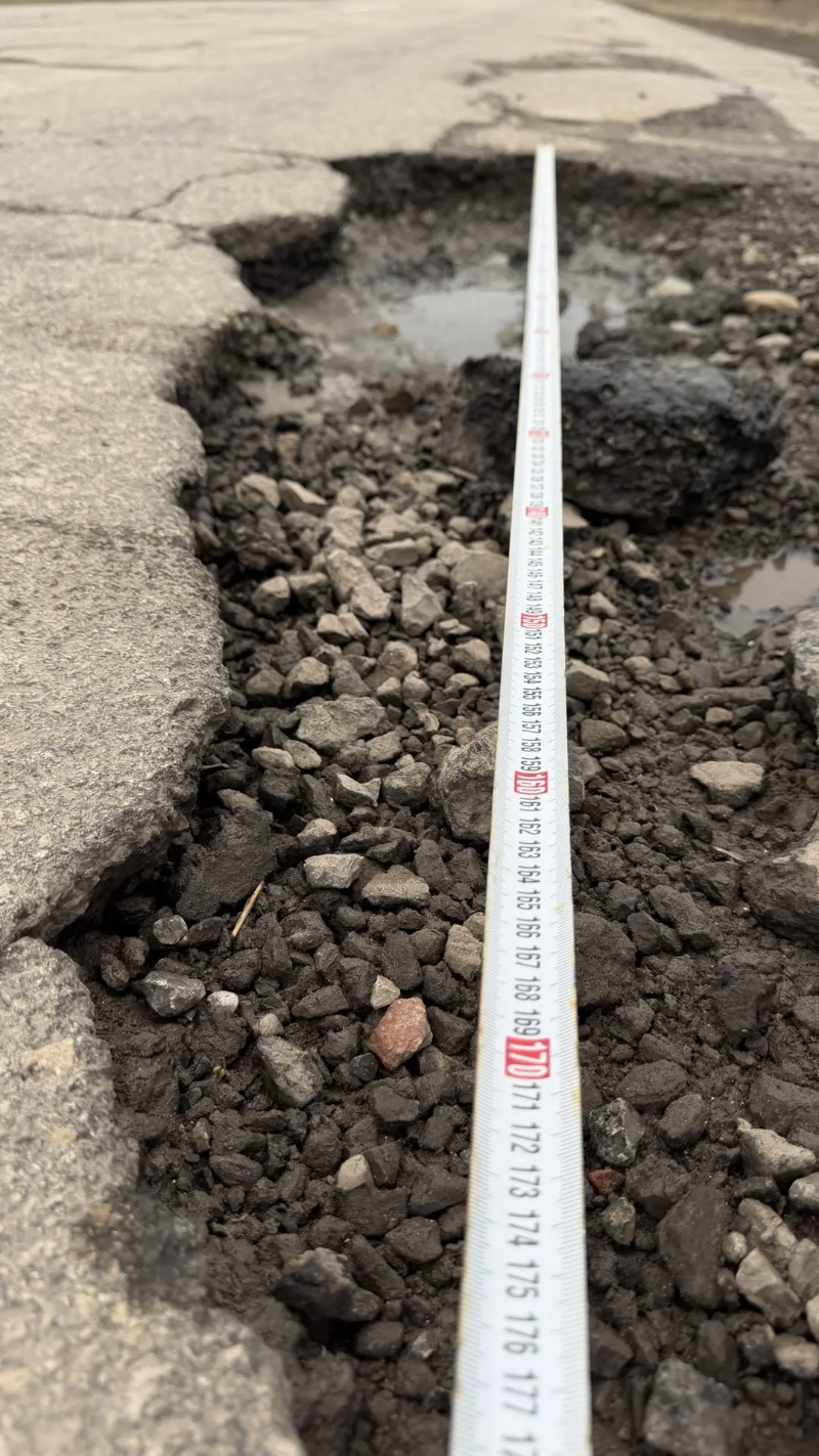 Уже в дневное время дочь пострадавшей поехала посмотреть на ту самую злополучную яму на дороге и была шокирована. Приложенные фотографии наглядно демонстрируют масштабы проблемы: глубокие выбоины, достигающие десятков сантиметров в длину и глубину, и свидетельствуют о крайней степени износа дорожного покрытия, а линейка, приложенная к яме, дает четкое представление о ее размерах.