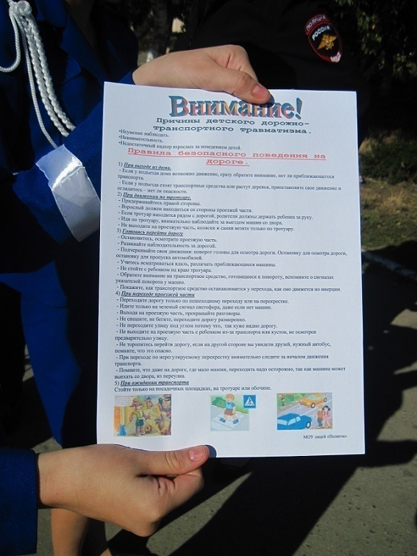 Помочь ГИБДД в этом деле вызвались ученицы 8 класса лицея «Политэк». Юные инспекторы дорожного движения, которые впервые участвовали в подобной акции, вышли на один из перекрестков в районе лицея и вручали прохожим листовки и памятки с предупреждением о необходимости соблюдать правила дорожного движения при переходе через дорогу.