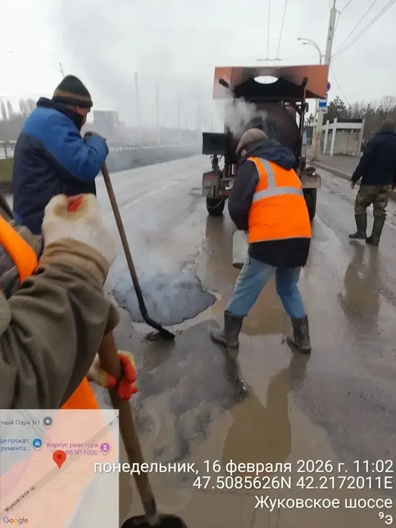 Сегодня утром, в Департаменте строительства и городского хозяйства рассказали, что на Жуковском шоссе работники подрядной организации «Созидатель» со вчерашнего дня выполняют ямочный ремонт литой смесью. Поскольку ремонт дороги можно выполнить только в весеннее время, когда начнут работать асфальтовые заводы, сейчас в феврале ремонт дорог возможен только рециклером с использованием асфальтобетона – литой смесью, которую заливают в дыры, тем самым временно устранив проблему.