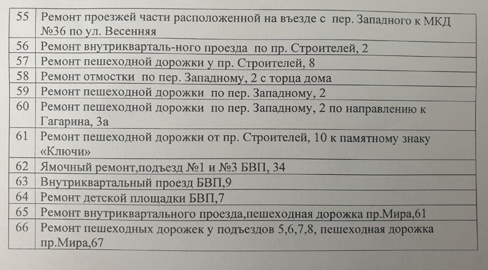На эти средства предполагается отремонтировать 66 отдельных участков дорог и тротуаров. Полный список можно посмотреть на фото ниже. Большая часть средств поступит за счет т.н. депутатских средств, которые выделяются из бюджета города на исполнение наказов избирателей.