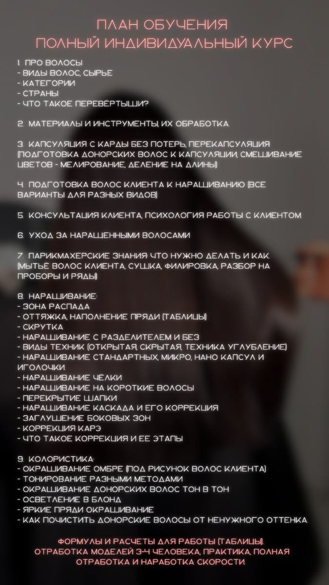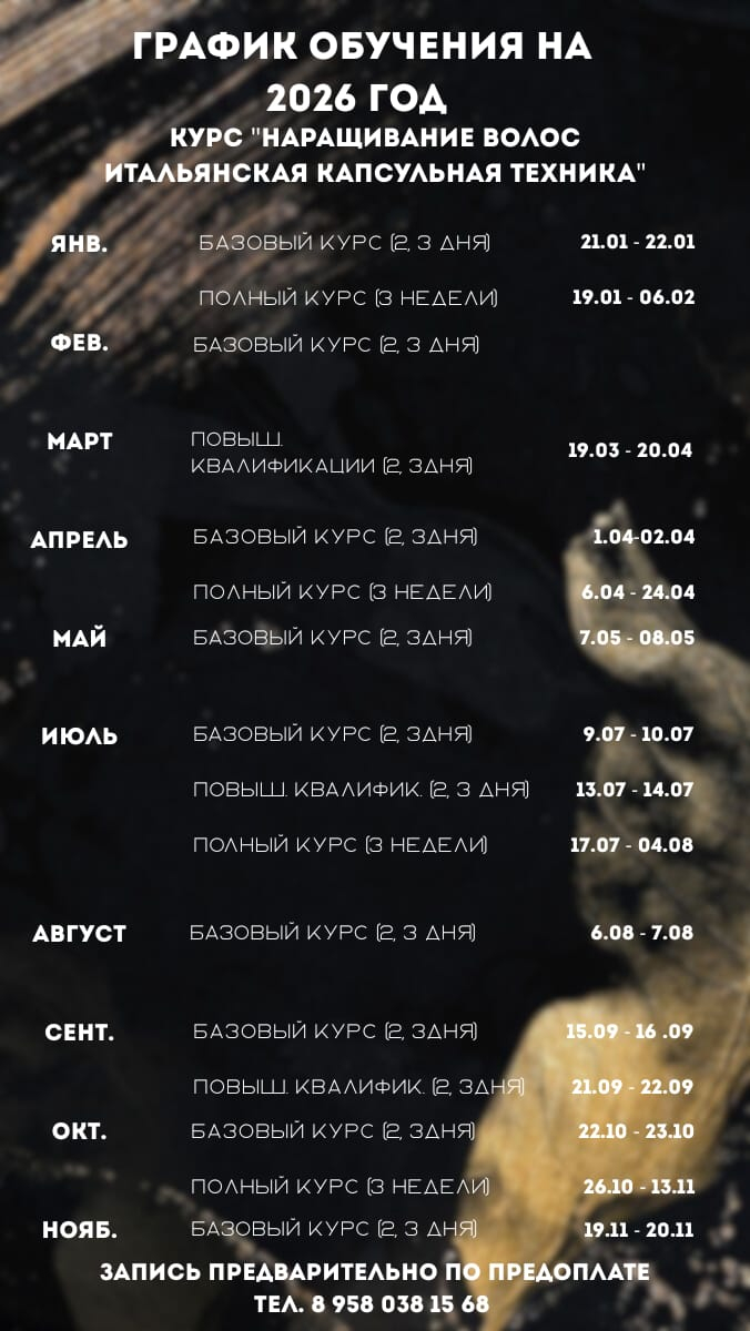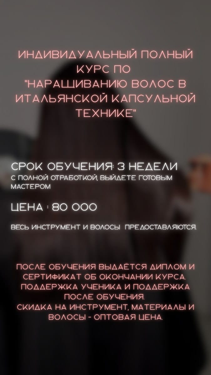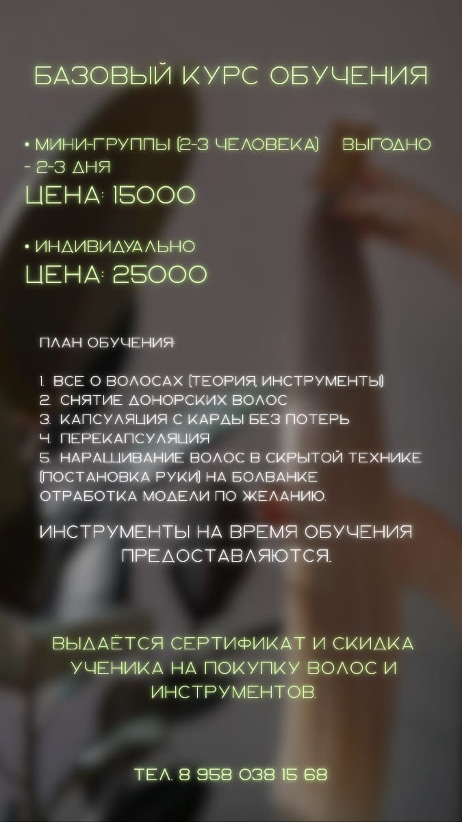 - Индивидуальный полный курс: начните с нуля и станьте сертифицированным мастером наращивания волос.