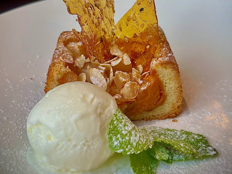 Хрустящая, рассыпчатая песочная корочка с маслянистыми нотками со сливочно-тыквенным кремом, сладкой грушей, шариком ванильного мороженого и кунжутной карамелью.
