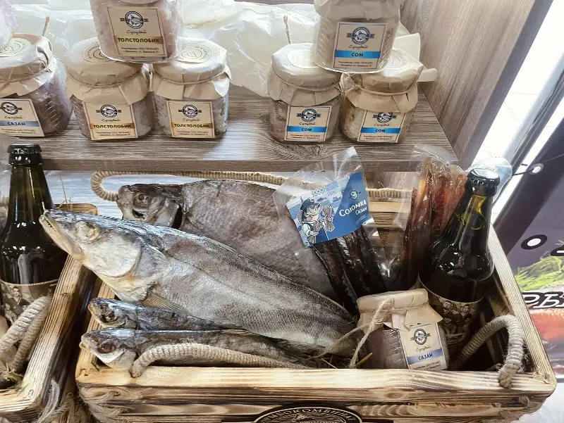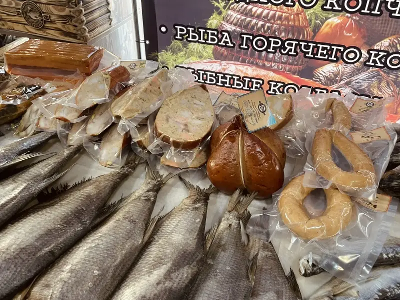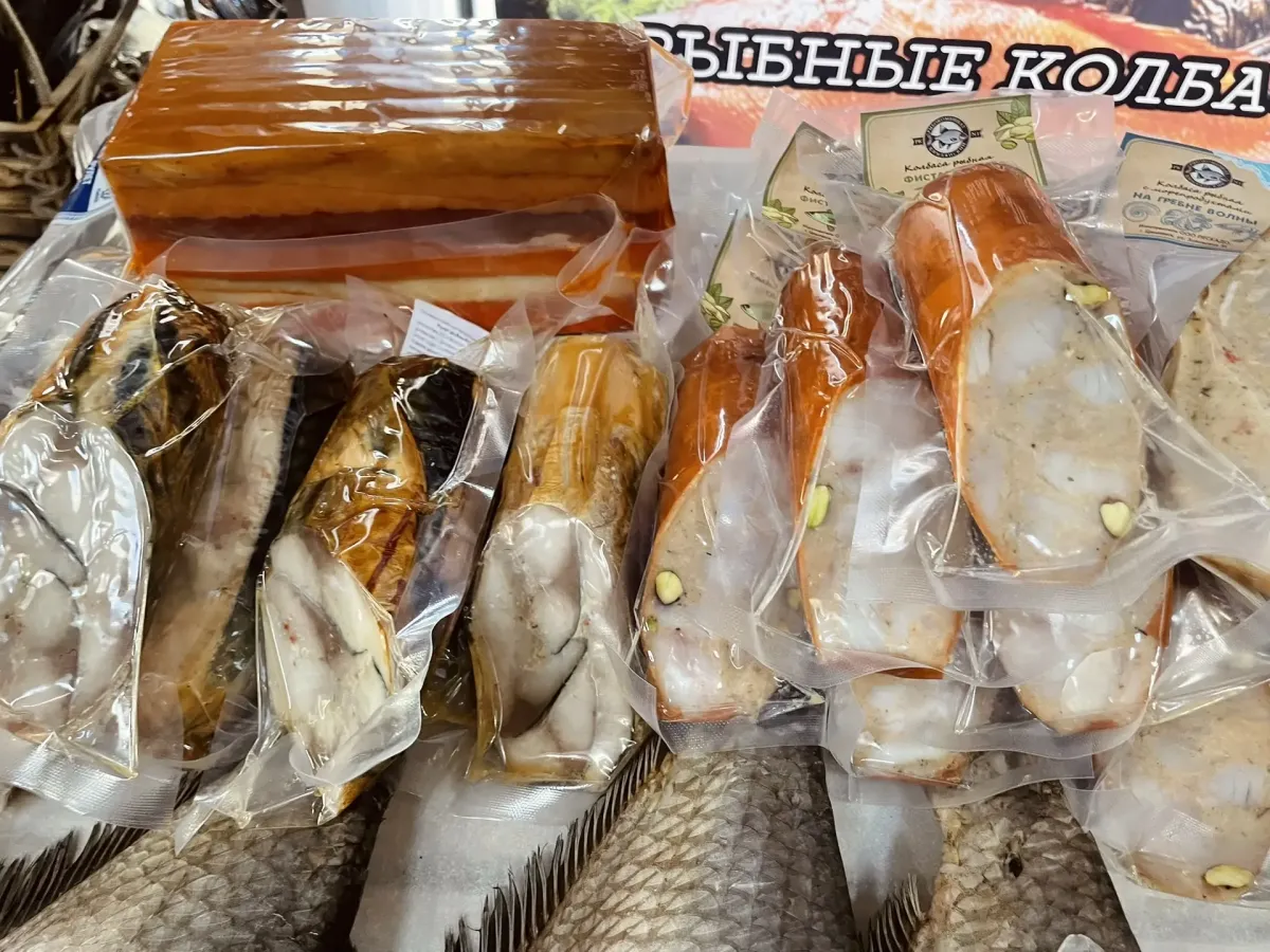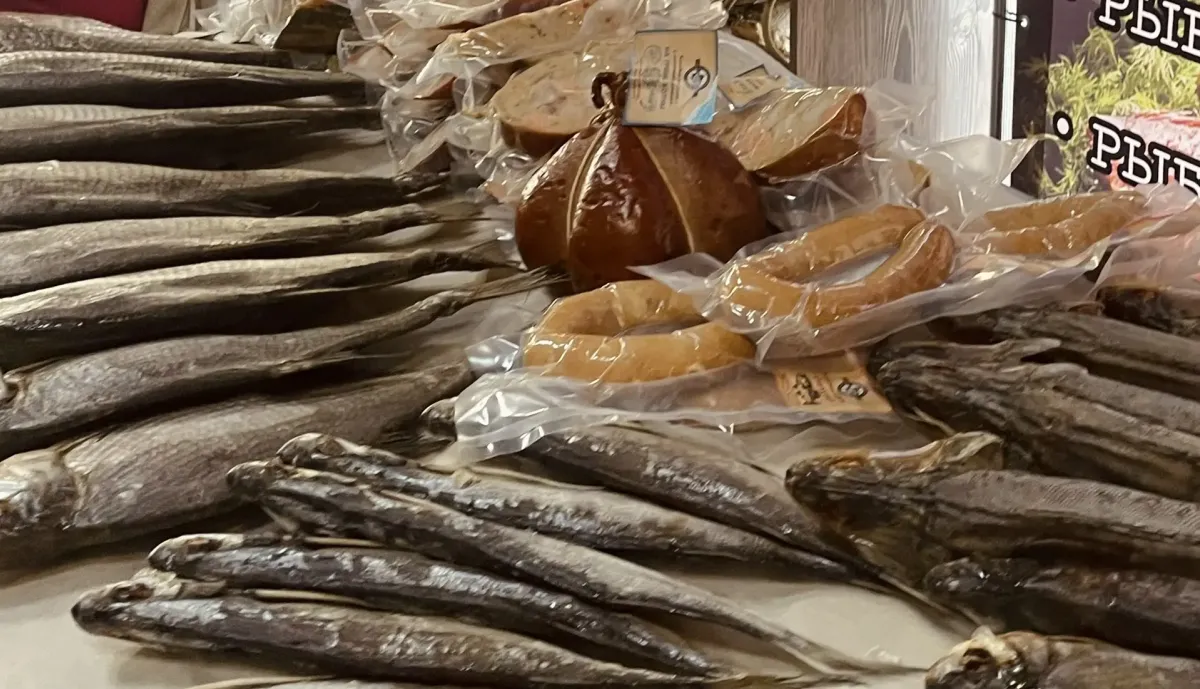 Особое внимание привлекла витрина с продукцией завода, демонстрирующая настоящее богатство и разнообразие – от изысканных рыбных колбас до загадочного и пленяющего сердца Сугудая.