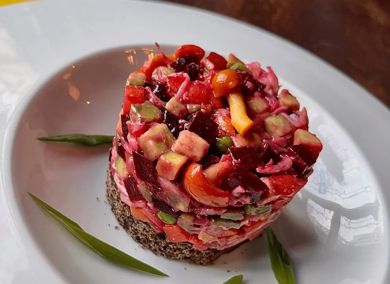 Авторская версия классического винегрета, который готовится с запеченной морковью и свеклой, молодым горошком, квашеной капустой, маринованными опятами и авокадо.