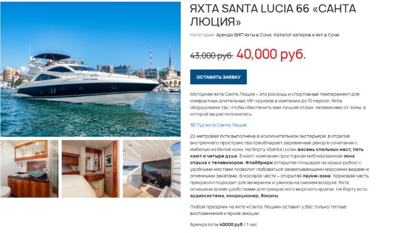 На побережье Черного моря такие яхты активно сдаются в аренду состоятельным туристам. Прогулки на такой яхте оцениваются тоже недешево. К примеру, в Сочи снять на час Santa Lucia или другие яхты подобной комплектации можно за 40000 рублей, аренда яхты на сутки стоит примерно 100 000 рублей.