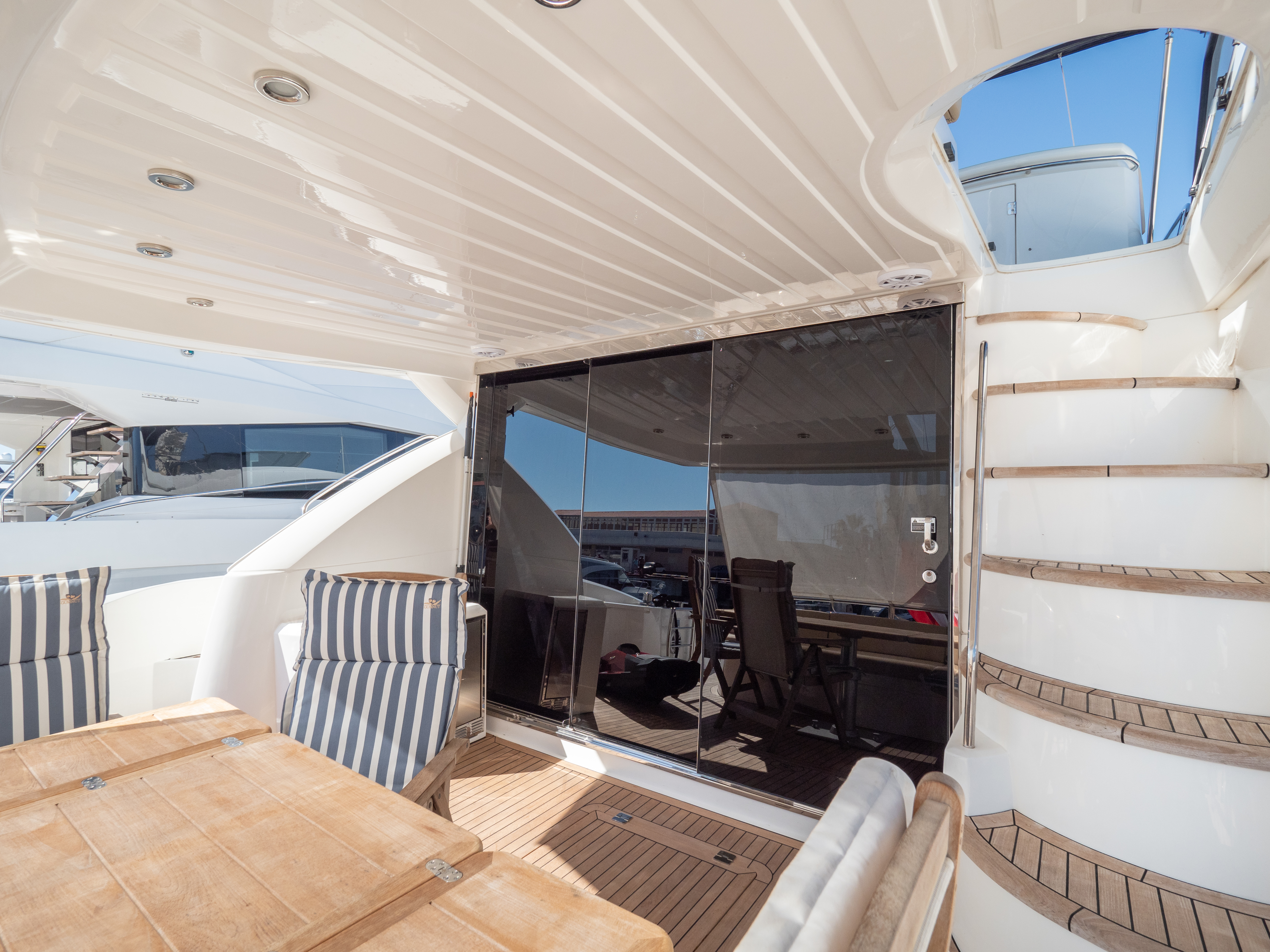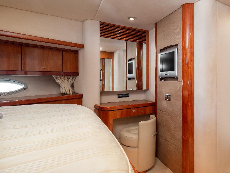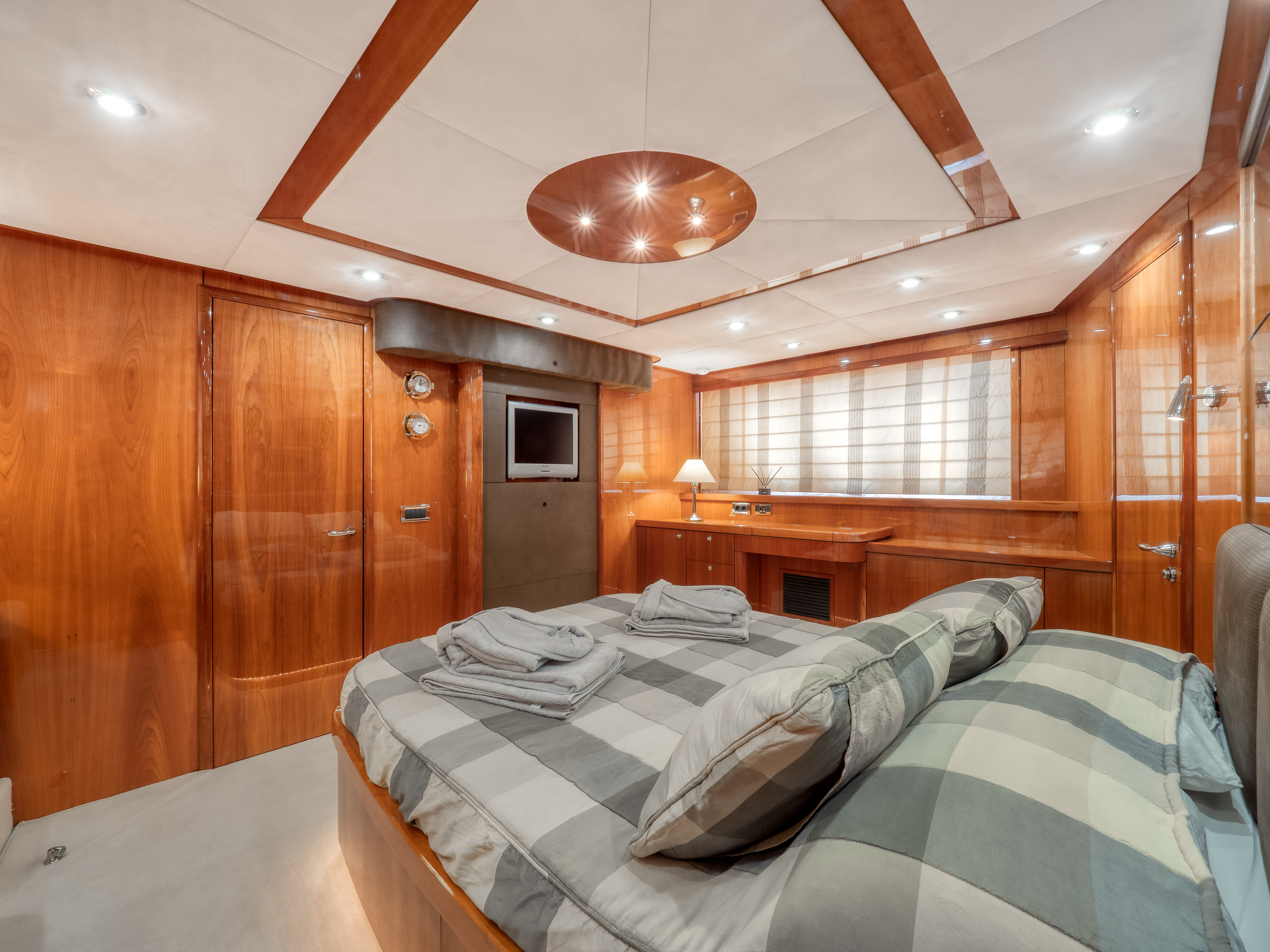 Интерьер яхты отделан деревом в сочетании с элегантной мебелью из белой кожи. Яхта укомплектована всем необходимым комфортного отдыха и приема гостей.