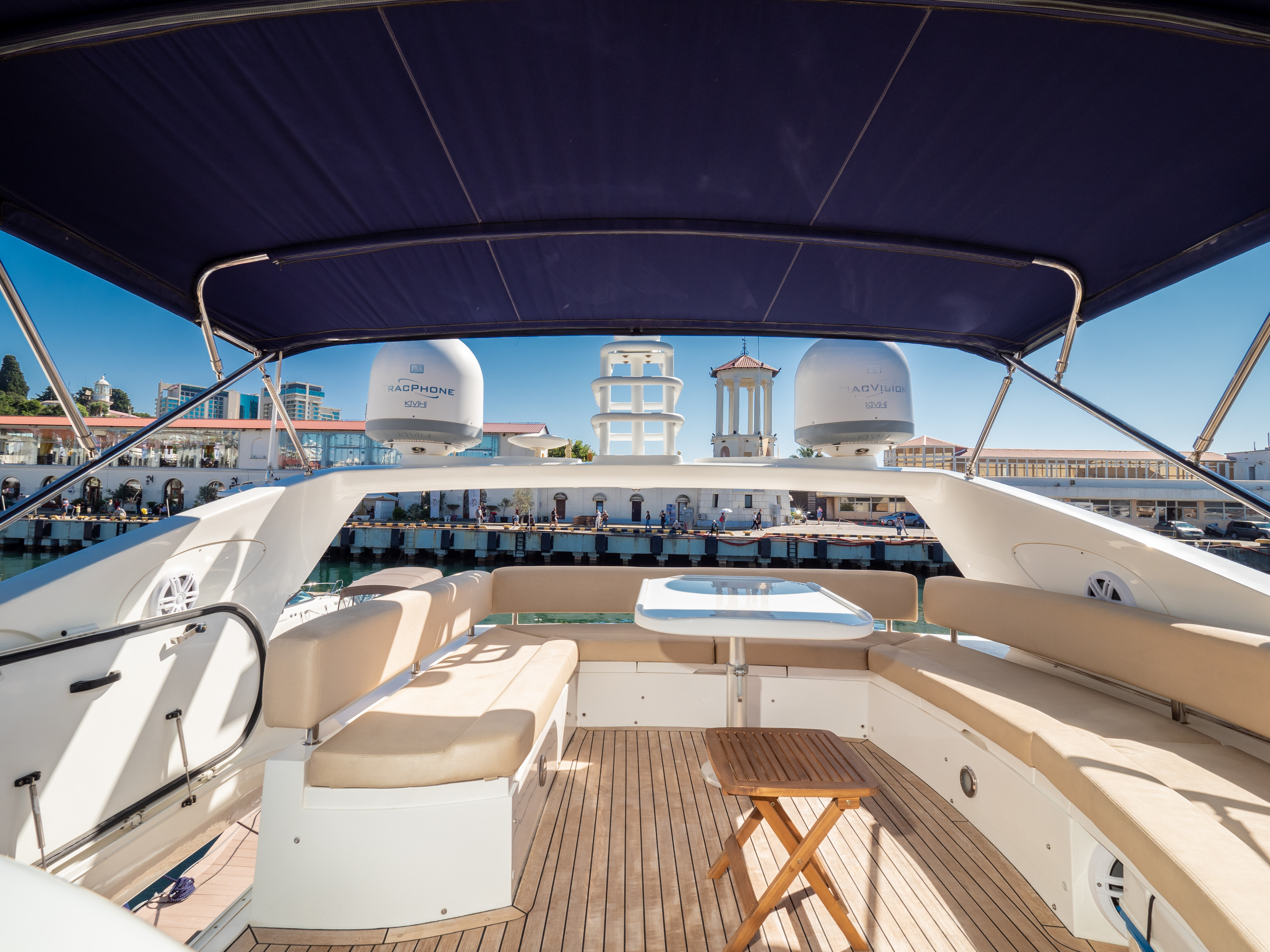 Открытая площадка на крыше – флайбридж, откуда открываются захватывающие виды на окрестности, лаунж-зона в носовой части яхты для любителей солнечных ванн и неспешных бесед.