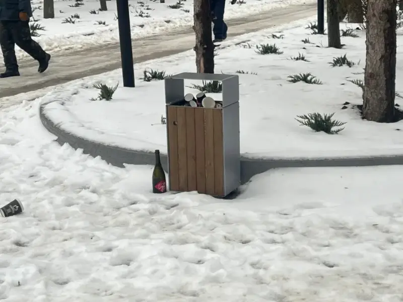 Регулярно коммунальщикам приходится собирать здесь пустые бутылки и пластиковые стаканчики, свидетельства ночных гуляний. И это в самый разгар зимы.