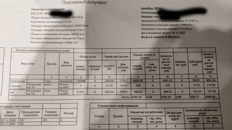 Для сравнения, в прошлом году общая сумма за аналогичные услуги составляла 4 800 рублей, из которых 3 900 рублей – отопление, а 900 рублей – 4 кубометра горячей воды. Таким образом, цены выросли более чем вдвое, причем счета были выставлены уже с учетом изменений тарифов.