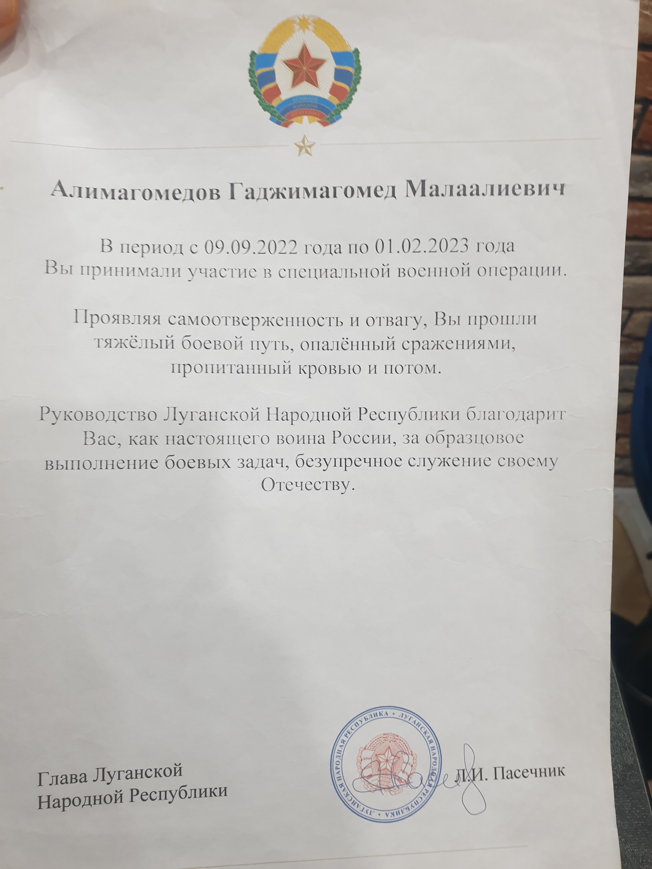 В редакцию «Блокнота» обратился житель поселка Денисовский Ремонтненского района Гаджимагомед Алимагомедов. В 2022 году он добровольцем из мест лишения свободы отправился в зону СВО, прошел через самые жестокие бои за Бахмут (Артемовск) в составе ЧВК, в после – принимал участие в боях на территории ДНР и Приднепровья. Он получил несколько тяжелых ранений, едва не лишивших бойца жизни. Осколки попали в позвоночник, в госпитале пришлось ампутировать левый глаз, а часть черепной коробки заменить металлической пластиной. За проявленное мужество Гаджимагомед был награжден медалью «За отвагу».