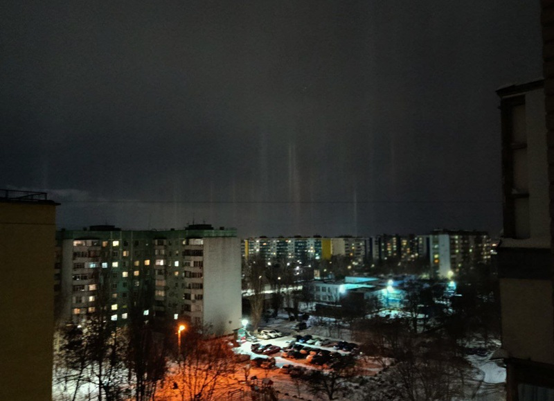 Фото и видео световых столбов сделали читатели «Блокнота». Горожане активно обсуждают появление оптического феномена в небе над городом.