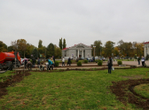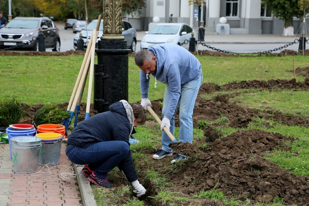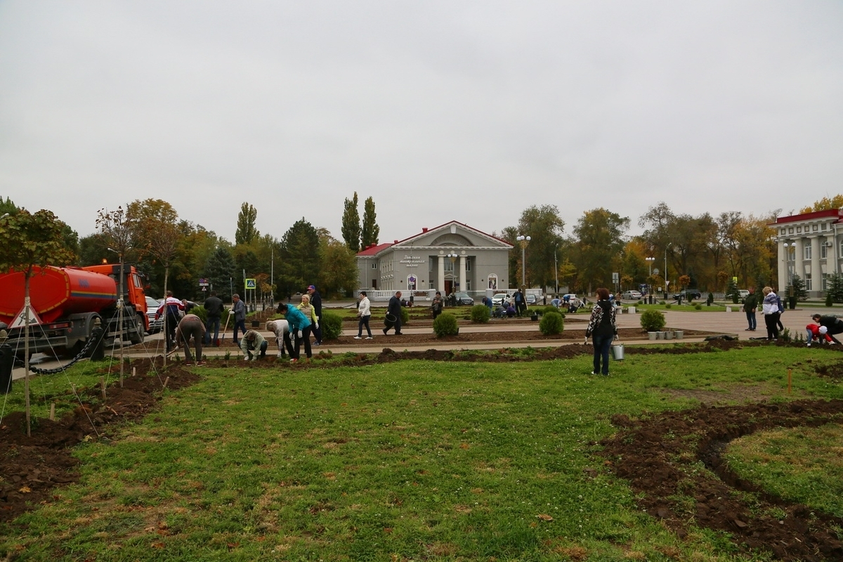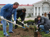 В сквере возле городской администрации, у памятника «Речник и рабочий», работники администрации, аппарата городской Думы и депутаты сажали туи и кустарники самшита.
