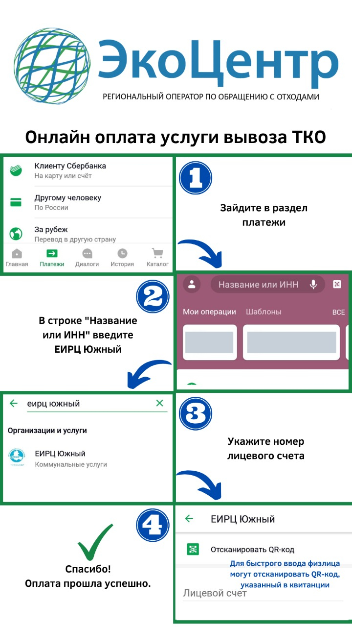 2. Оплата доступна по номеру лицевого счета для физических лиц и по номеру договора для юридических лиц. В приложении «Сбербанк онлайн» необходимо ввести в строке поиска «ЕИРЦ Южный» или выбрать в разделе «ЖКХ и домашний телефон» -> «Квартплата», затем указать номер лицевого счета или номер договора и подтвердить сумму платежа.