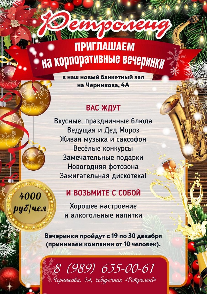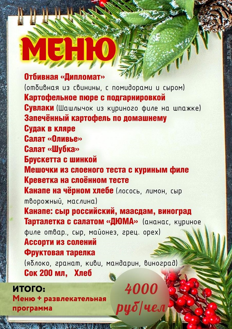 За 4000 рублей с человека вас ждут вкусные праздничные блюда, сказочная атмосфера и зажигательная программа.