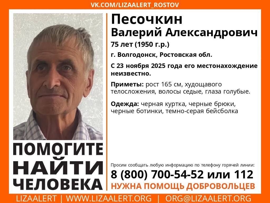 В воскресенье 23 ноября в Волгодонске исчез 75-летний пенсионер Валерий Александрович Песочкин. Утром мужчина вышел из своей квартиры в доме №189 по улице Степной в Юго-Западно районе. После его родные потеряли все контакты с ним.