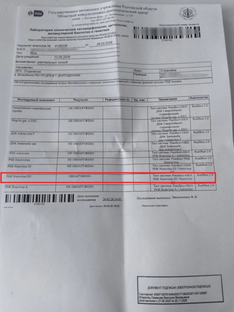 - 22 февраля сходили вечером покушать с семьёй, народу было очень много. Утром 24 февраля стало плохо всем членам семьи, у всех рвота, температура 39, и все сопутствующие симптомы... И подумать не могли, что отравление. Вызвали скорую, накололи нас, полегчало. Утром решили поехать в больницу. И каково было моё удивление, когда педиатр спросив, ели ли мы фастфуд на неделе, и получив ответ: «да, Бургер Кинг», встала и вышла из кабинета. Зашла через пару минут, и на мой логичный вопрос: «Мы такие не первые?», последовал ответ: «К сожалению, далеко не первые». Результаты анализов неутешительные, к сожалению. Дети ещё минимум на неделю дома, - рассказала волгодончанка.